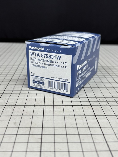 今回の査定では、未使用品でも評価が分かれやすい外箱状態を中心に確認しました。外箱の潰れ・擦れ、圧痕、ラベルの欠損や汚れ、湿気由来の波打ちやヤケ感の有無などです。調光スイッチは型番指定で探されやすいため、未開封で外箱状態が良好な個体は再販前提でも扱いやすく、査定が安定しやすいのが特徴です。